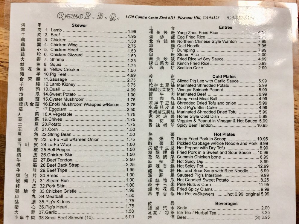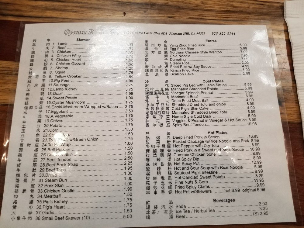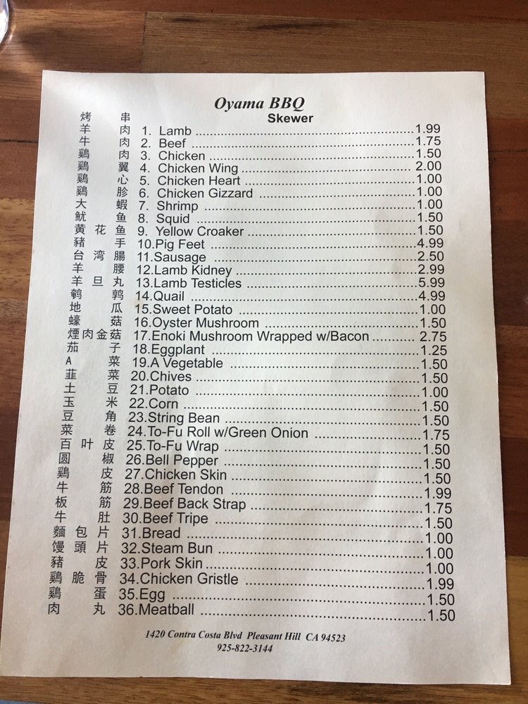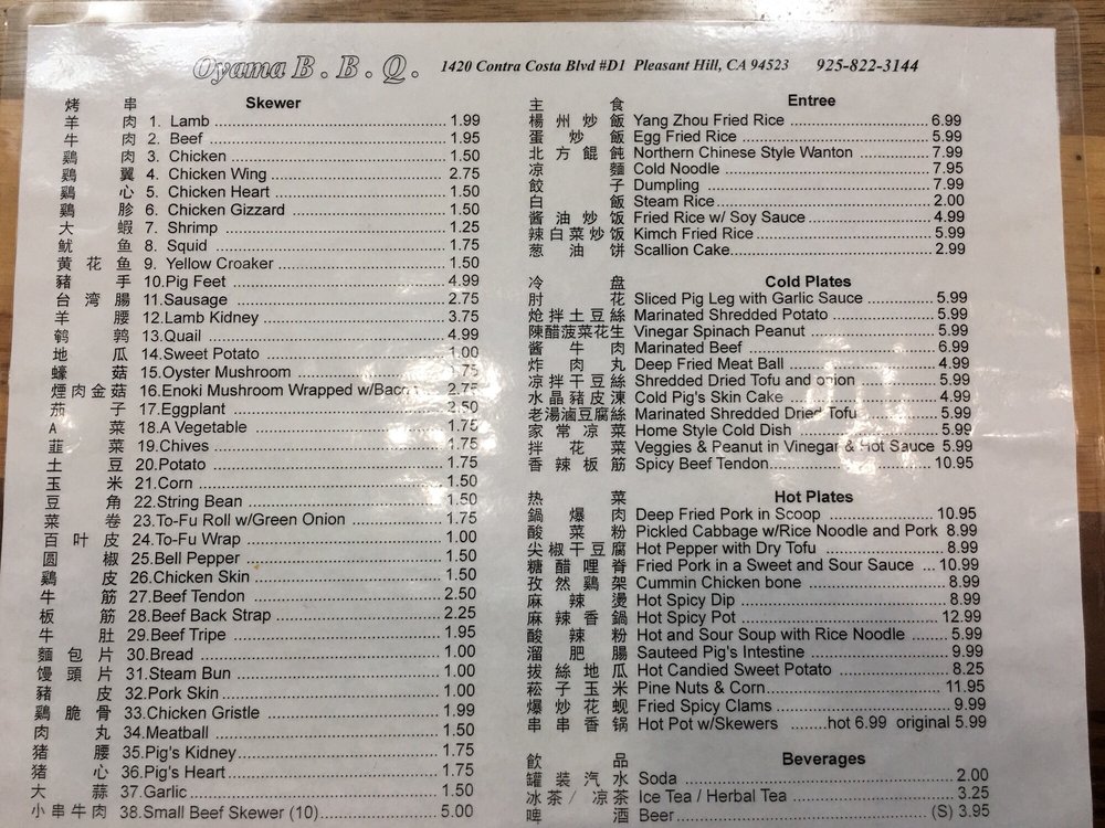Oyama BBQ is a seafood, barbecue, and Chinese restaurant located in Pleasant Hill, CA. Known for its delicious skewers, the menu offers a wide variety of options including lamb, chicken feet, beef, and chicken hearts. Customers rave about the fresh and made-to-order dishes, with some mentioning the spicy fried chicken cubes as a standout. The restaurant's welcoming ambiance, late-night hours, and excellent service contribute to its popularity among regulars. Offering vegetarian options and happy hour specials, Oyama BBQ caters to a diverse range of tastes. Whether you're a fan of seafood, barbecue, or Chinese cuisine, this restaurant is a must-visit for a delightful dining experience.